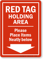 These signs mark the "Red Tag Area" or "Holding Area" in a workplace where items go during the "Sort" phase.