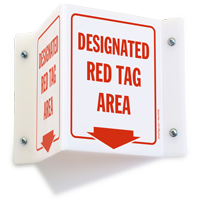 These signs mark the "Red Tag Area" or "Holding Area" in a workplace where items go during the "Sort" phase.