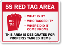 These signs mark the "Red Tag Area" or "Holding Area" in a workplace where items go during the "Sort" phase.