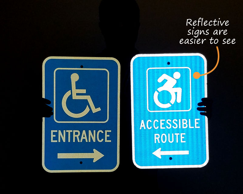 Our metal accessible signs are made of durable aluminum which last for years in outdoor conditions. Even our basic 63 mil thick aluminum sign lasts for at least 10 years outside. If you order an aluminum sign with the Diamond Grade Reflective sheeting, the guaranteed minimum durability will extend to 12 years. All the signs are laminated for superior durability and resistance to graffiti, moisture, and chemical splashes. 3M matching ink and film components also contribute to the long life of these signs.