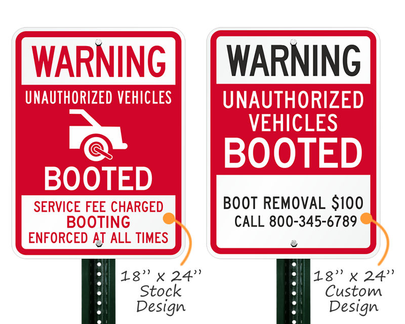 While specific local ordinances may dictate size requirements, common effective sizes for Auto Boot Warning Signs are typically 18" x 24" or 12" x 18".