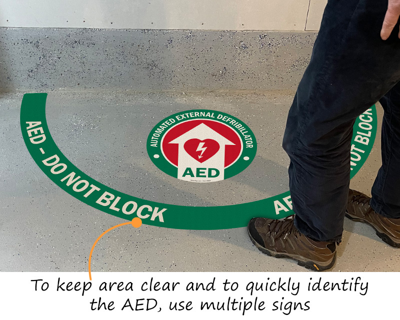 AED signs include standard wall-mounted identification signs, 3D projecting signs for hallways, and floor signs to mark the location of the device from multiple angles.