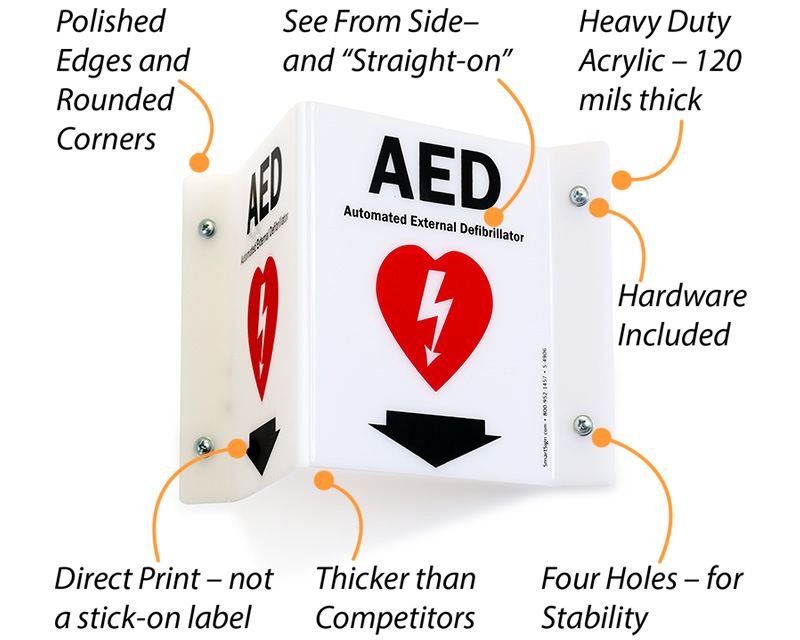 • • Great for hallways, our Projecting AED signs are printed on two sides. 180 Degree Projecting Signs have the message printed three times.
