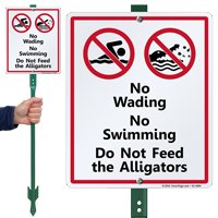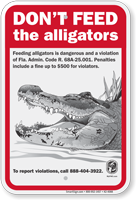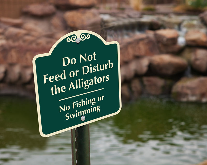 Common messages include "Danger - Alligators," "Do Not Feed Alligators"" and "No Swimming." "Do Not Feed" is critical because feeding causes gators to lose their fear of humans.