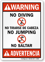 Common messages include "no diving" / "no clavarse," "no lifeguard on duty" / "no hay salva vidas presente" and "pool rules" / "reglas de la piscina." you can also find signs specifically in spanish.