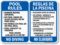Common messages include "no diving" / "no clavarse," "no lifeguard on duty" / "no hay salva vidas presente" and "pool rules" / "reglas de la piscina." you can also find signs specifically in spanish.