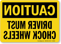 "Mirror Image" signs (with reversed text) are available and highly effective. They allow drivers looking in their rear-view mirrors to read the "Chock Wheels" message correctly without having to turn around, increasing the likelihood of compliance.