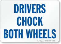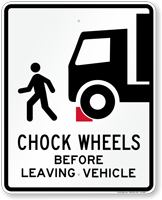 "Mirror Image" signs (with reversed text) are available and highly effective. They allow drivers looking in their rear-view mirrors to read the "Chock Wheels" message correctly without having to turn around, increasing the likelihood of compliance.