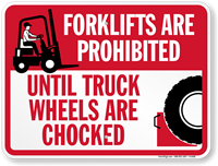Per OSHA 1910.178, chocks prevent trucks from rolling away during loading. You can find these mandatory markers in our chock wheels signs collection.