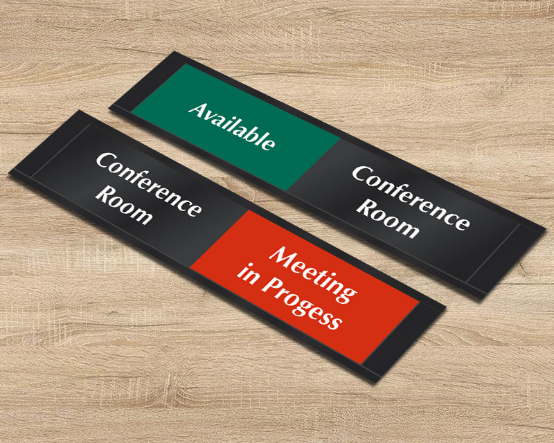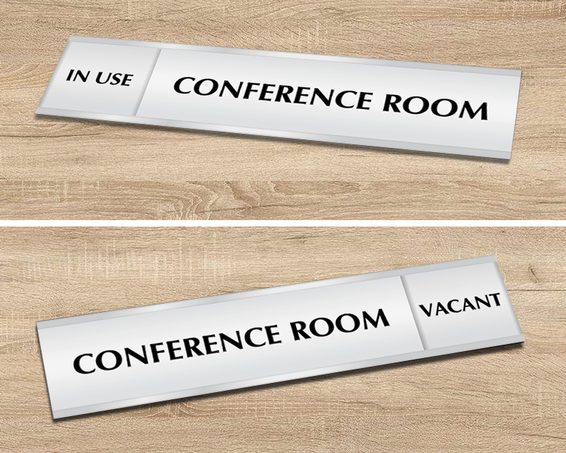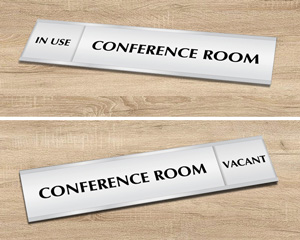 Our Sliding Door Signs are best for walled-in conference rooms. Because no one can see through the conference rooms with permanent walls, it is difficult to tell whether someone’s in or not. Our slider signs consist of two panels. The top panel moves back and forth from side to side to indicate whether the room is “Vacant” or “In-use”. Such signs are also ideal for frosted or tinted glass-walled conference rooms. These signs keep folks from accidentally walking into a meeting in progress.
