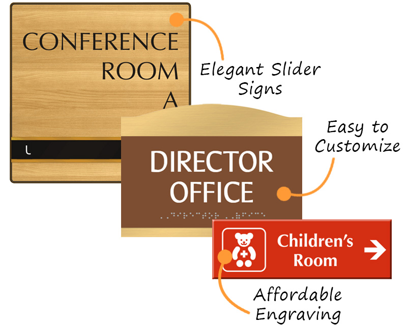Our best-selling custom signs include personalized braille signs (for room numbers and names), custom door nameplates, custom sliding signs (for "In Session / Available"), and modern custom clear acrylic signs.