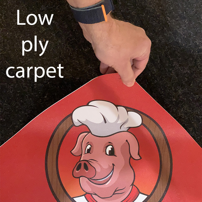 Custom floor signs come with strong adhesive backing and are extremely easy to install. These are most suited for smooth floors and can be applied to low-ply commercial carpets as well. All that you have to do is clean the surface and apply your decal. Floor decal materials are best suited for smooth surfaces, although SlipSafe heavy-duty and AlumiGrip can be used on textured, hard surfaces as well.