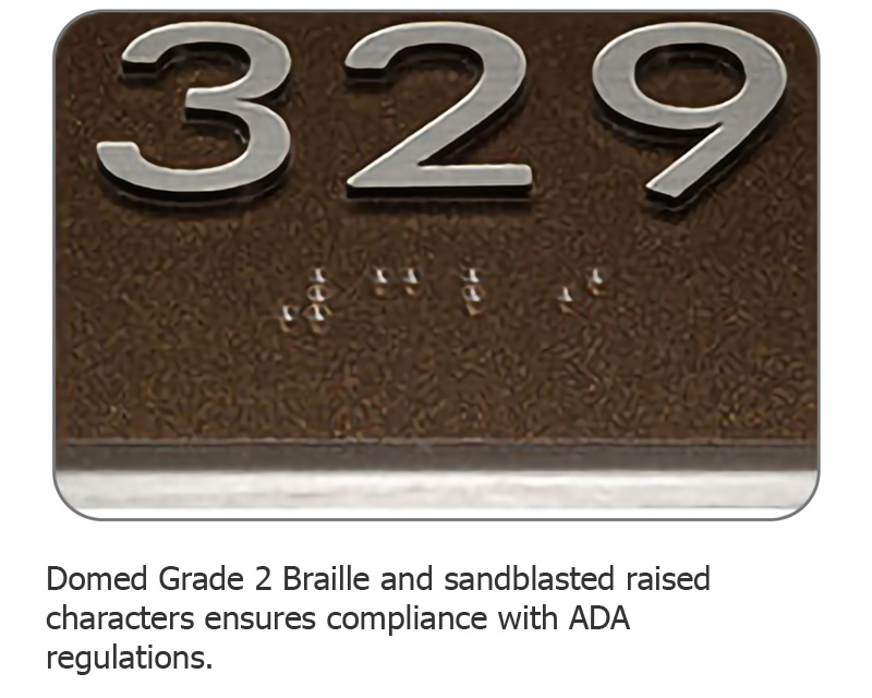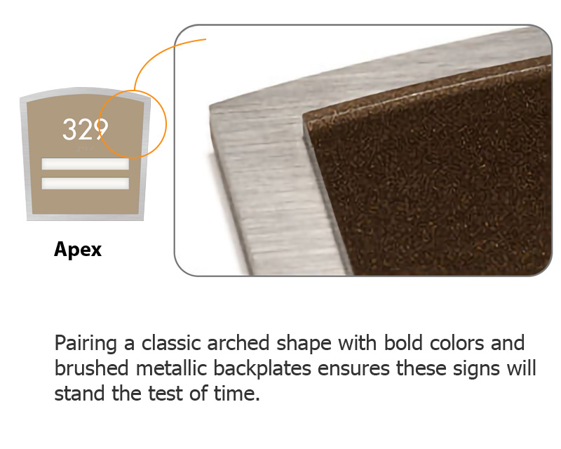 Our signature Apex sign series features a classic arched shape, with a brushed metallic back plate and a faceplate of hand-painted acrylic. With several color combinations to choose from, your Apex sign will enrich and enhance any decor with its bold design. Complete with Grade II Braille, these ADA compliant signs are bound to impress.