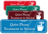 Libraries, medical facilities, recording studios, meditation spaces, study areas, and testing centers benefit from quiet signs, with placement at entrances and throughout spaces reinforcing noise expectations. They are particularly important near our testing in progress signs.
