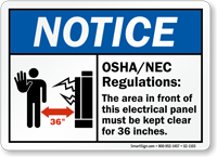 • • Do Not Block Electrical Panel Signs, Electrical Panel Keep Clear Signs - OSHA section 1926.403 clearly indicates to keep a minimum clearance of 30" to 48" around the electrical panel.