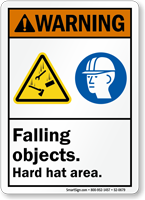 A "Falling Materials" sign warns of a specific, immediate overhead hazard, while a "Notice: Hard Hat Area" sign defines a broader zone where head protection is mandatory at all times. We recommend using both: the "Hard Hat Area" sign at all entrances to the site, and the "Falling Materials" sign directly below the specific work area.