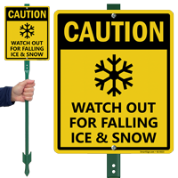 Property owners and managers have a duty to warn visitors of known hazards including falling ice and snow from rooftops, and our falling snow warning signs help fulfill this duty and reduce liability in slip-and-fall and falling ice injury claims, popular with landlords, property managers, and building owners in northern climates during winter months.