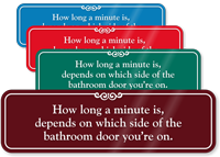 We offer funny bathroom signs in a variety of materials, sizes, and formats. You may choose from adhesive labels and plastic, magnetic and aluminum signs. The durability of these signs ranges from over one year outdoors for the most cost-effective option to over fifteen years outdoors for the carefully crafted premium signs. Indoor usage provides for even longer life. This information is visible on every individual product page and varies according to sign material.
