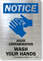 You should try our 20 mil thick and 32 mil thick DiamondPlate Aluminum Hand Washing Signs. The anodized aluminum plates feature graphics that are embedded into the pores of the aluminum. The 20 mil thick signs come with 3 mil thick, 3M adhesive (467MP) while the 32 milt thick signs come with 5 mil thick, 3M (468MP) adhesive that sticks permanently to any flat surface. Signs have up to 20 years of outdoor life and take temperatures up to 1000°F. DiamondPlate™ door signs withstand constant abuse and abrasion due to people touching the sign surface when opening or closing the door. These photo-sensitive anodized aluminum plates are great for door signs.
