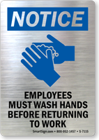 You should try our 20 mil thick and 32 mil thick DiamondPlate Aluminum Hand Washing Signs. The anodized aluminum plates feature graphics that are embedded into the pores of the aluminum. The 20 mil thick signs come with 3 mil thick, 3M adhesive (467MP) while the 32 milt thick signs come with 5 mil thick, 3M (468MP) adhesive that sticks permanently to any flat surface. Signs have up to 20 years of outdoor life and take temperatures up to 1000°F. DiamondPlate™ door signs withstand constant abuse and abrasion due to people touching the sign surface when opening or closing the door. These photo-sensitive anodized aluminum plates are great for door signs.