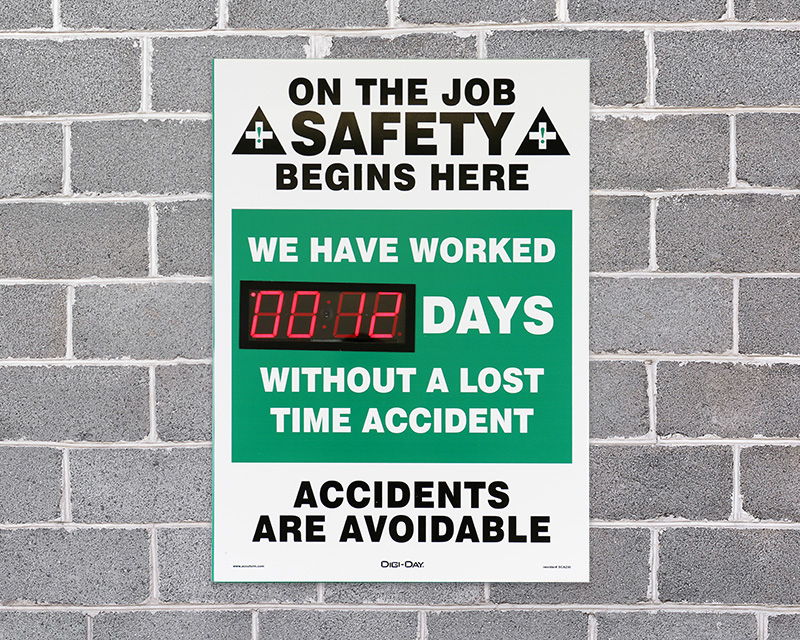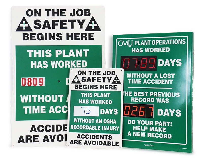 • • Digital Safety Scoreboards are an inexpensive way to remind about safety. Try our digital electronic display, magnetic numbers, or zip track numbers.