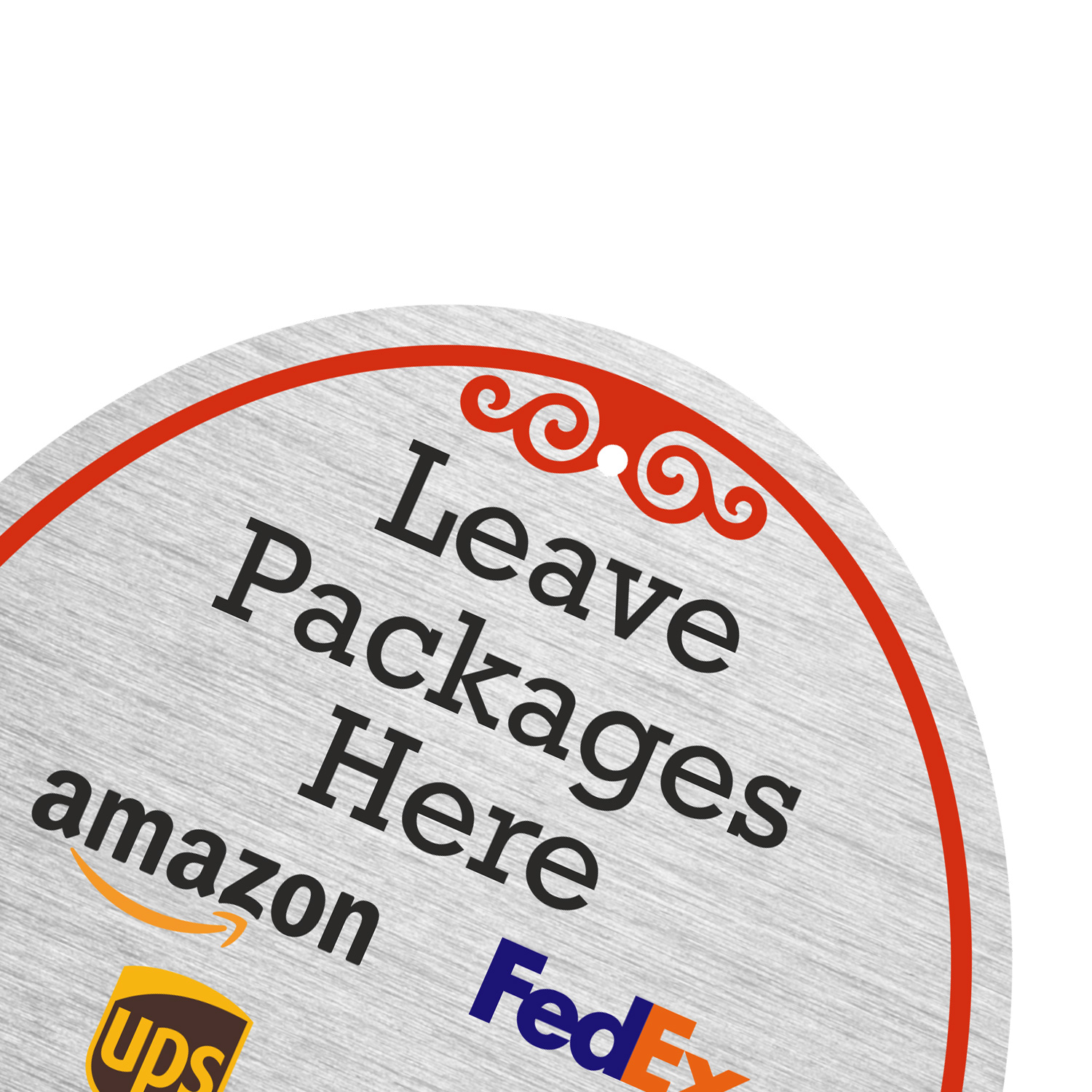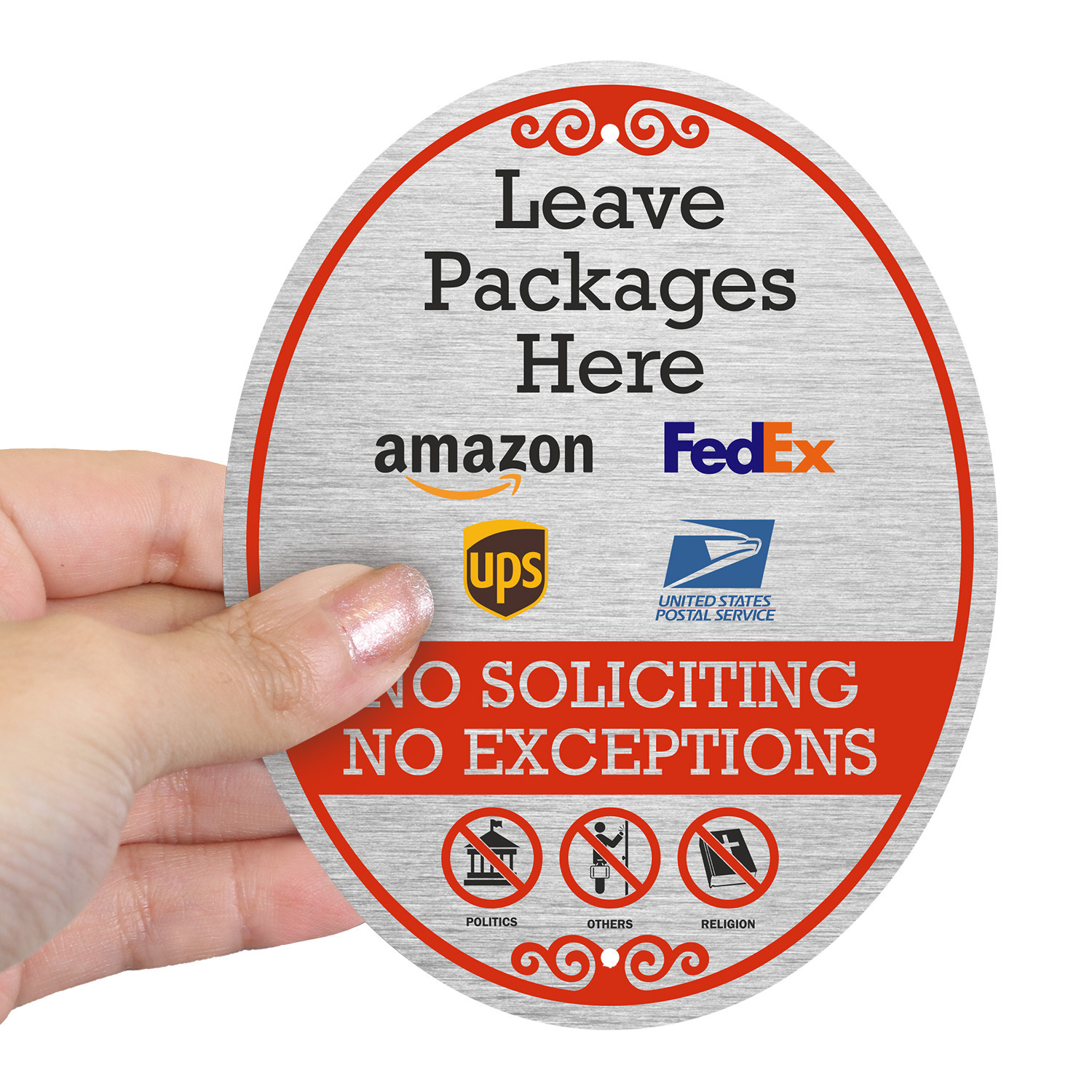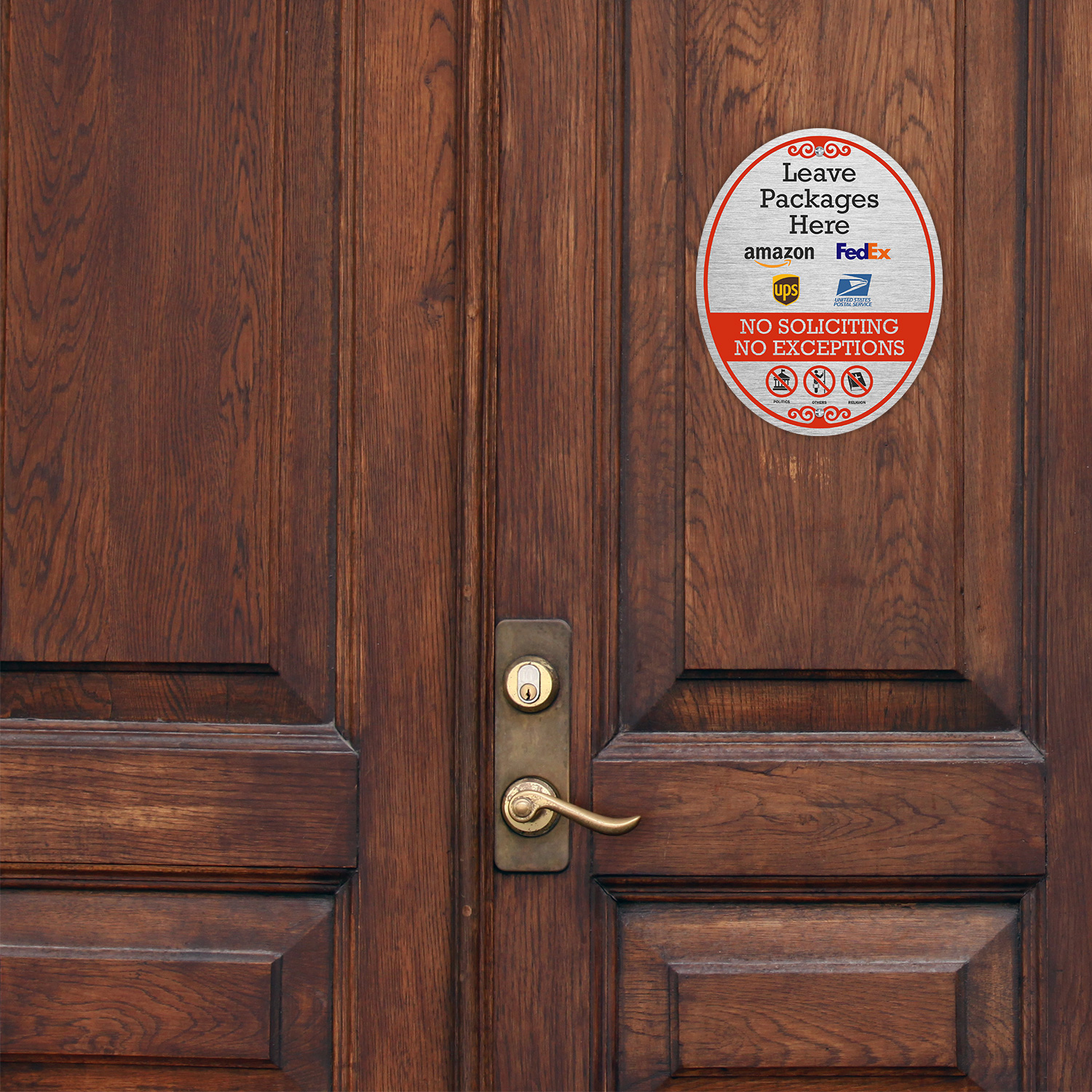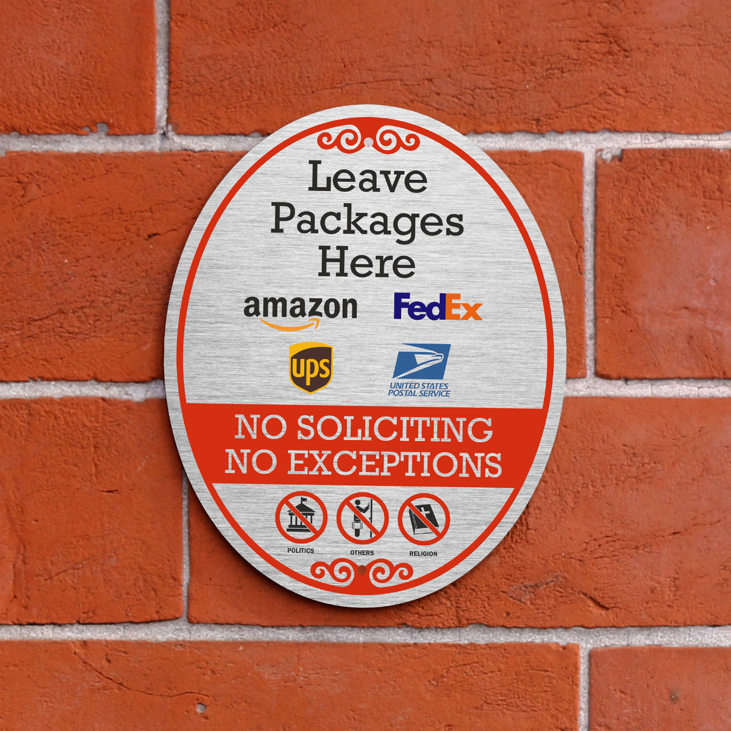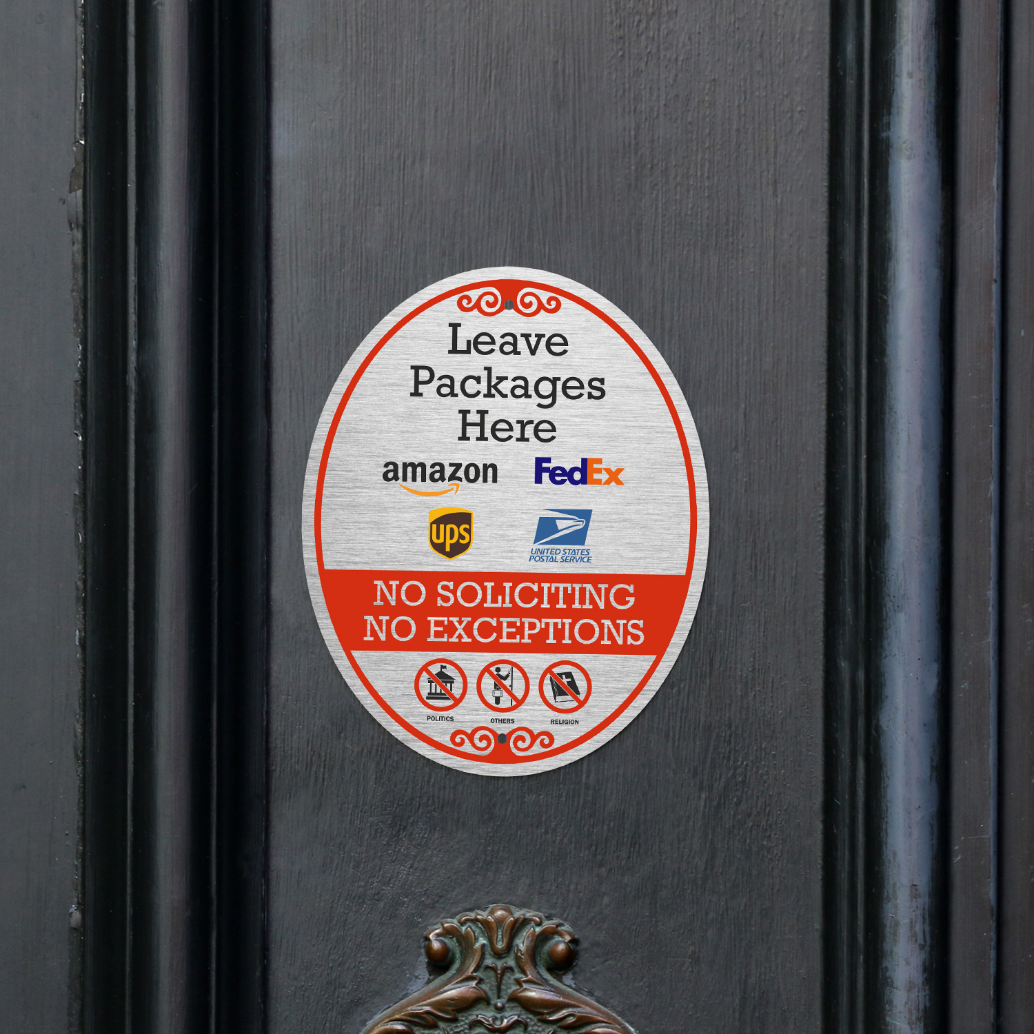 DiamondPlateâ„¢ Package Delivery Door Sign: Leave Packages Here, No Soliciting, No Exceptions (Amazon, FedEx, UPS, USPS Logos) DP-0170