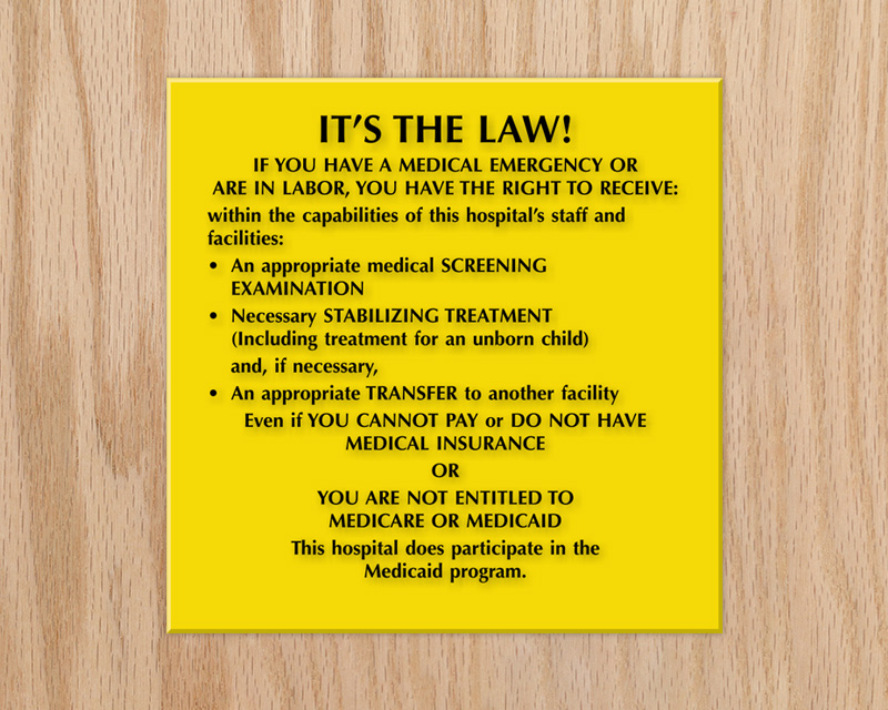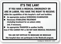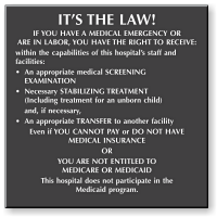 Post Medical Emergency Law Signs to duly inform eligible patients of their rights to appropriate medical care.