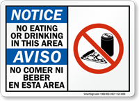 Bilingual signs break linguistic barriers and reach out to people understanding different languages. We offer No Eat or Drink Signs in English and Spanish to reach a larger audience. You should go for a bilingual sign if workplace instructions are frequently translated into some other language (Spanish here) or if a substantial non-English speaking audience (like Hispanics) needs to be aware of the information relayed.
