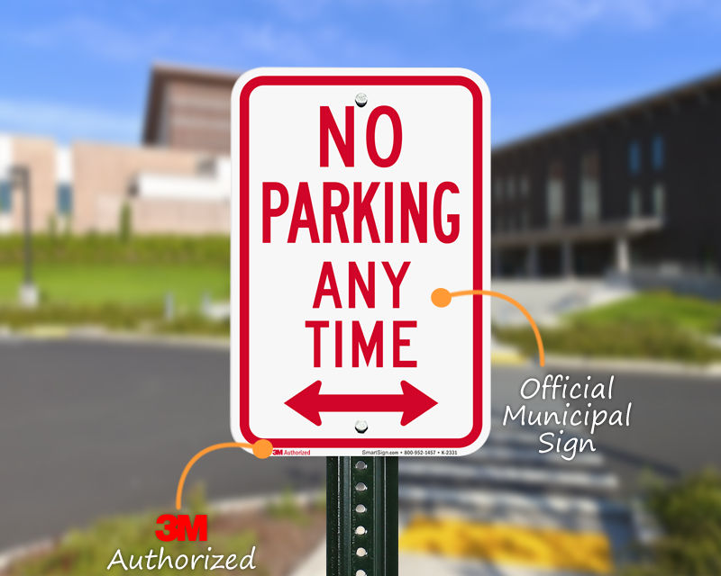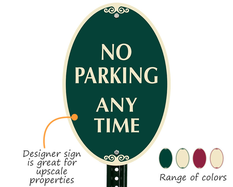 Customized no parking any time signs are produced very quickly and typically ship within one to two business days. The fast manufacturing process ensures you receive your critical parking enforcement signs right away, allowing you to immediately secure your property against unauthorized vehicles.
