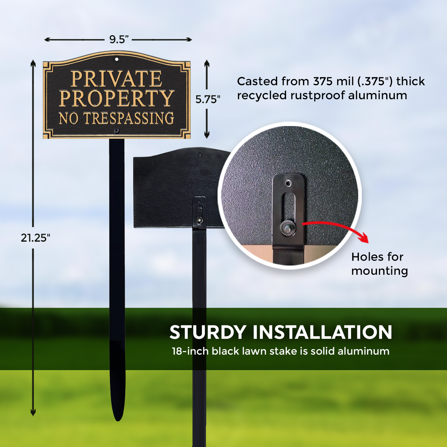 - Installation hardware includes screws and one 18" lawn stake.