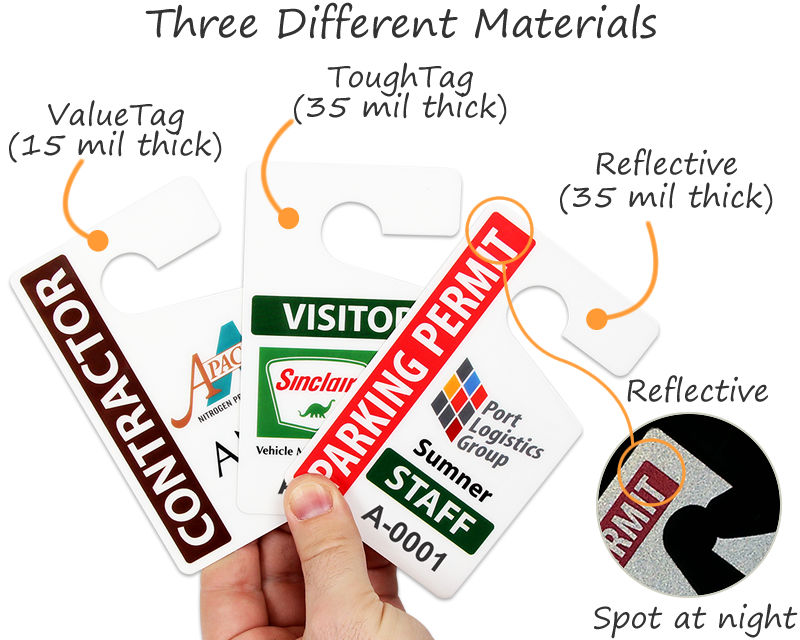 Our Custom Parking Hang Tags are available in the reflective format as well. These reflective tags are made of 30 mil thick plastic and have an engineer-grade reflective layer sealed within them. These cannot be counterfeited and are virtually indestructible.
