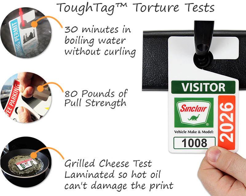 ToughTags are our heavy-duty Parking Hang Tags made of 35 mil thick plastic with embedded graphics. These are laminated tags that will retain their shape even in the bake-oven conditions of a car. Featuring a glossy finish, our ToughTags can be easily wiped clean and withstand long-term wear-tear for years.