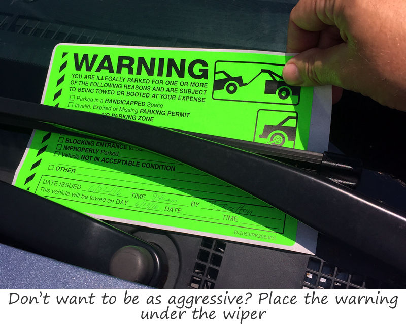 • • Make sure that violators do not easily forget the warning. Strong ScrapeIt™ adhesive requires that you must scrape off the sticker. Of course, in some situations (for example an initial infraction), you may not want to adhere the sticker to the window. In these cases, just place the sticker underneath the wiper.