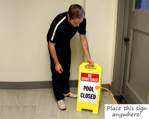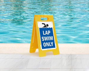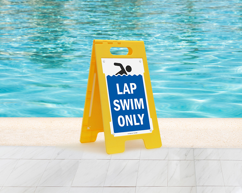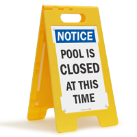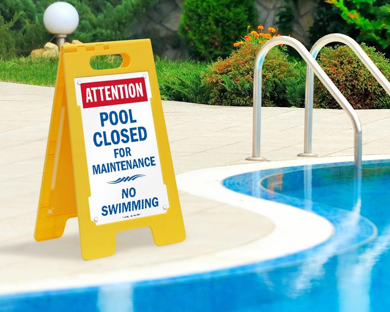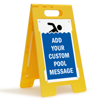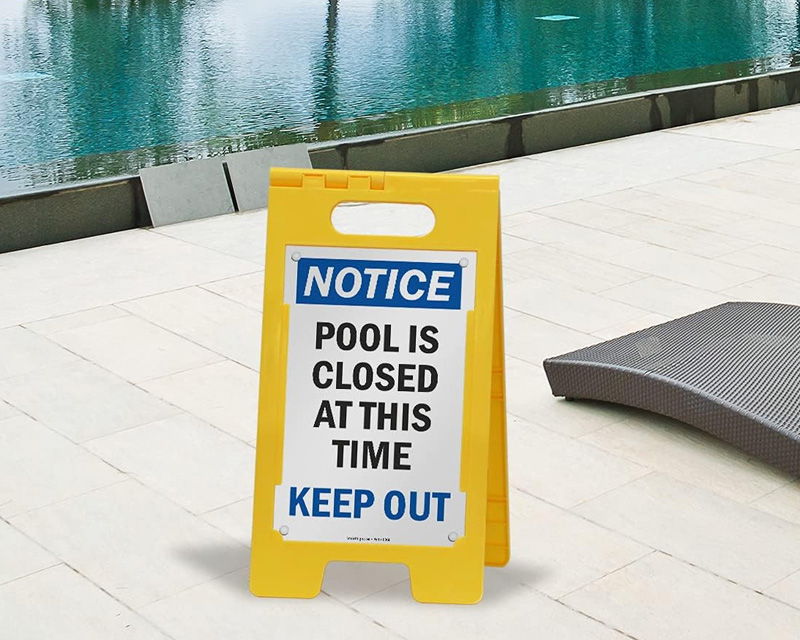 Some portable signs have interchangeable inserts, allowing you to switch between messages like "no lifeguard on duty" and "pool closed" using the same frame. You can also customize the insert using our custom swimming pool signs service.