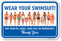 Cut-off jeans are prohibited because the frayed edges shed rapidly, clogging pumps. metal rivets on jeans can also scratch water slides or pool surfaces. You can include this specific warning on custom swimming pool signs.