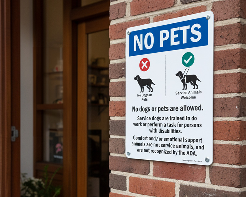 - • Prohibition & Policy Enforcement Signs such as No Smoking, No Pets Allowed, No Weapons / No Guns, and Service Animal Requirement Signs.