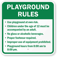 School Playground Signs are your first line of defense against any unwanted activity and damage to your school playgrounds. Whether you want to keep the playground area secure from trespassers and criminals or warn kids to play at their own risk, these signs fit the bill.