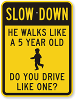 Funny sign warns drivers to slow down in areas where children are present in the vicinity. Install it in driveways, near parks, schools, or residential areas.