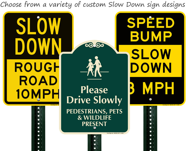 Custom slow down signs may be more suitable than stock signs when you want to convey a specific message, warning, or restriction. These also give you the option to add details like community or neighborhood name. You may simply select your preferred slow down sign template, personalize it using our quick and easy customization wizard, and be ready with your custom sign in no time.