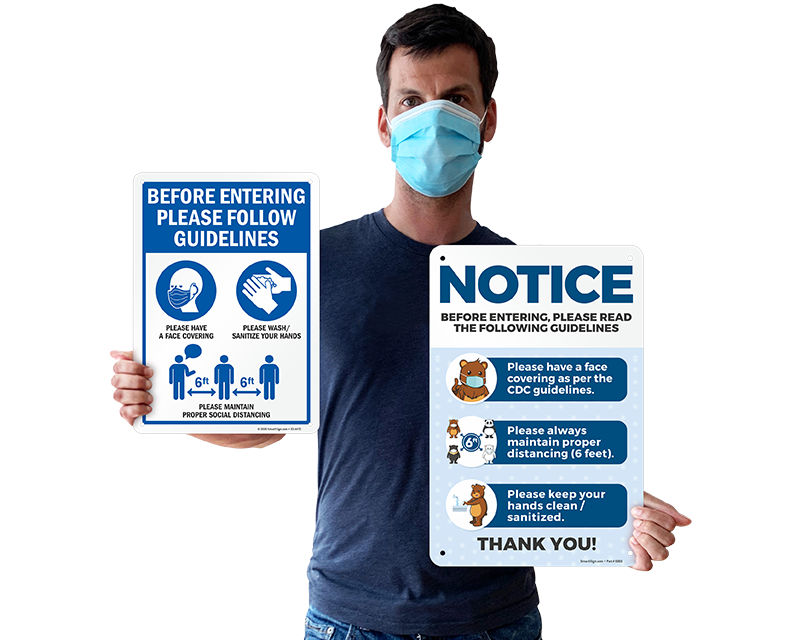 Social distancing signs should be posted both indoors and outdoors of facilities and establishments. While wall signs, as well as social distancing glass door and window cling signs, work well when you want to communicate policies such as face-covering, hand hygiene, etc, floor decals and floor markers help you clearly mark the 6-feet distance and are rather hard to ignore.