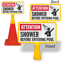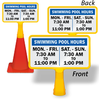 Want to display pool information, safety messages, and rules only for a temporary period? Hail our Pool ConeBoss Signs. Cone Top Pool Signs are very versatile and easy to use. Fit them over a regular-sized traffic or safety cone and that’s it — no installation hardware needed. What’s more? You can customize your message using our custom pool signs.