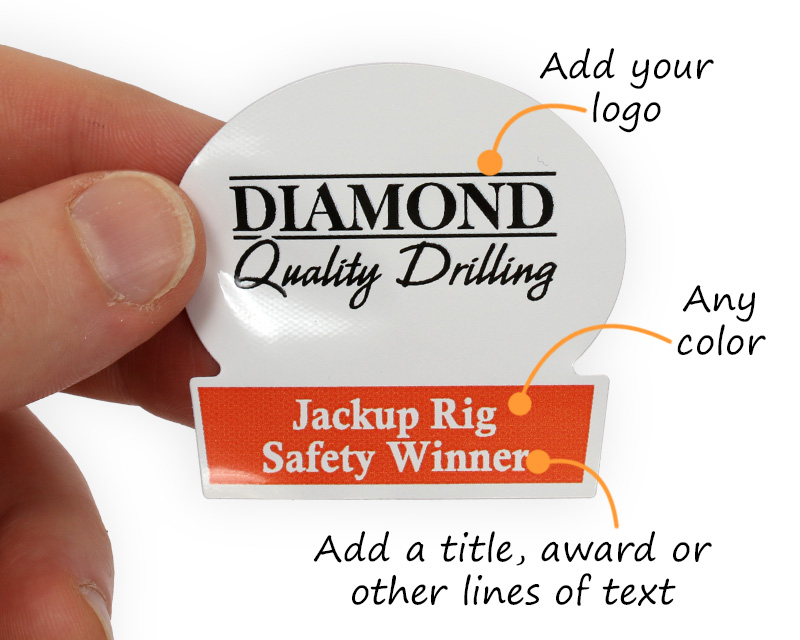 Size: 2" x 2.125" Material type: HatHuggers® Conformable Vinyl Labels - Process Full Color Printing