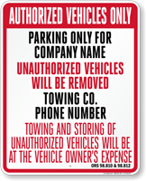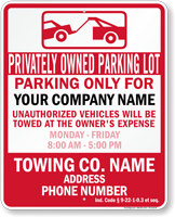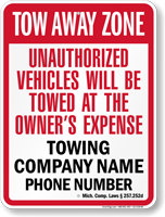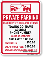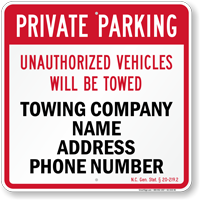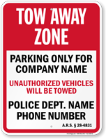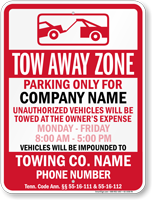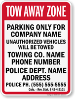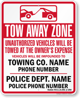 • • Find compliant tow away signs below. Local laws may vary, so we recommend you check with your local authorities before placing an order.