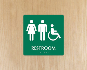 Yes, most of our designer unisex restroom signs have Grade 2 Braille and are ADA compliant. These signs are available in 44 faceplate colors, with the option to choose from gold, silver, and copper color backplates for many of these signs.