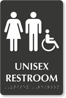 Yes. We offer unisex restroom signs in English, Spanish, and both languages. These signs are tactile and feature Grade 2 braille. Made using rigid, non-glare plastic, these signs are available in 15 color schemes and come with foam adhesive strips.