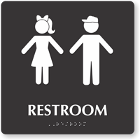 • • Our restroom signs comply with ADA signage requirements with raised letters, California Grade II Braille, symbols for enhanced accessibility.