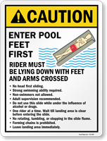 Going down head first is extremely dangerous and can lead to spinal injuries or drowning upon entry. Signs strictly enforce the "face up, feet first" riding position to ensure pool safety.