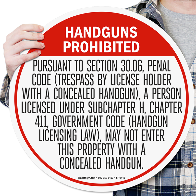 Floor signs can't be missed coz they are right under the nose! This SlipSafe™ Floor Sign featuring the Concealed Carry of Handguns Prohibited Law (Section 30.06) is ideal for all facility owners in Texas who wish to ban guns on their property.